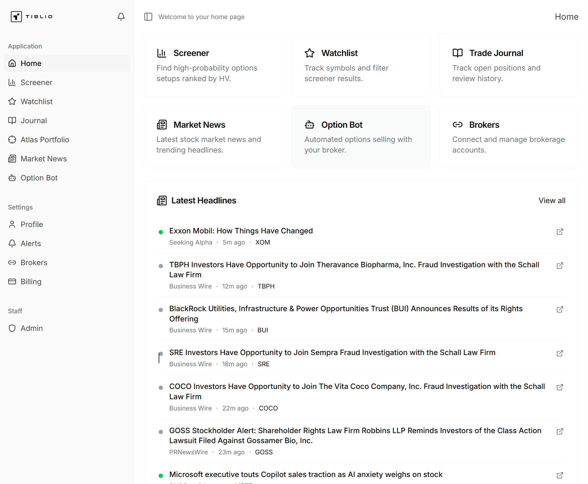 Every night, Tiblio computes historical volatility across the entire options market and ranks every contract on probability of profit.