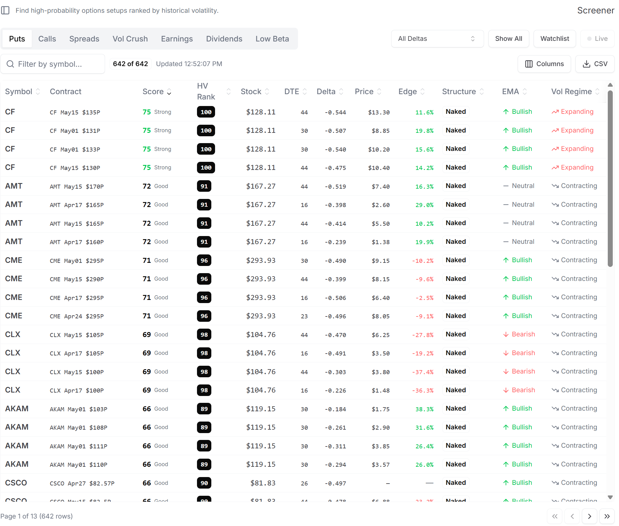 7 screen types powered by historical volatility analysis. Find high-probability puts, calls, spreads, and vol crush setups.